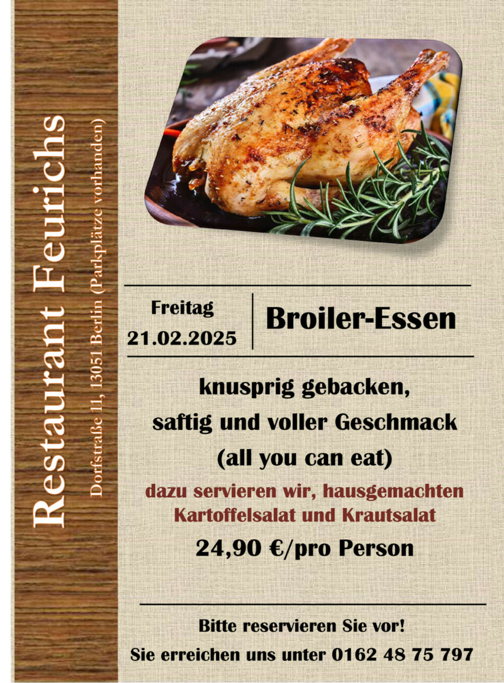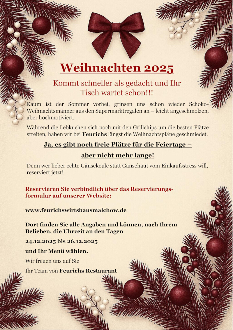 Ihre Reservierung nehmen wir gern telefonisch entgegen oder über den Reservierungsbutton auf unserer Homepage.